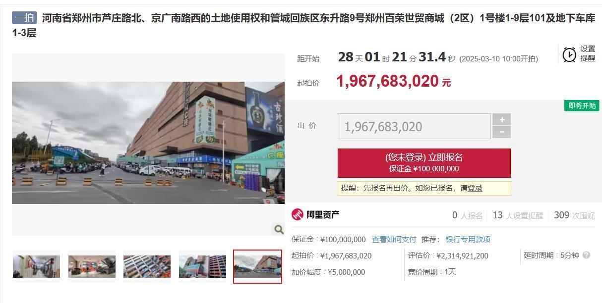 【大河财立方消息】2月10日,阿里司法拍卖平台显示,郑州百荣世贸商城部分资产将于3月10日进行拍卖,起拍价19.68亿元。资产处置单位为郑州市中级人民法院,目前已有13人设置提醒,共计309次围观,暂无人报名。